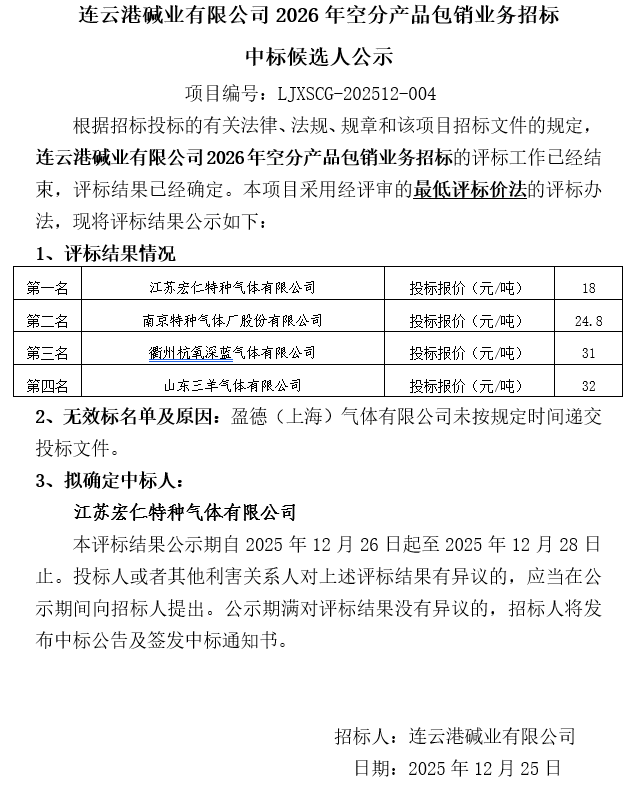連云港堿業(yè)有限公司2026年空分產(chǎn)品包銷業(yè)務招標中標候選人公示