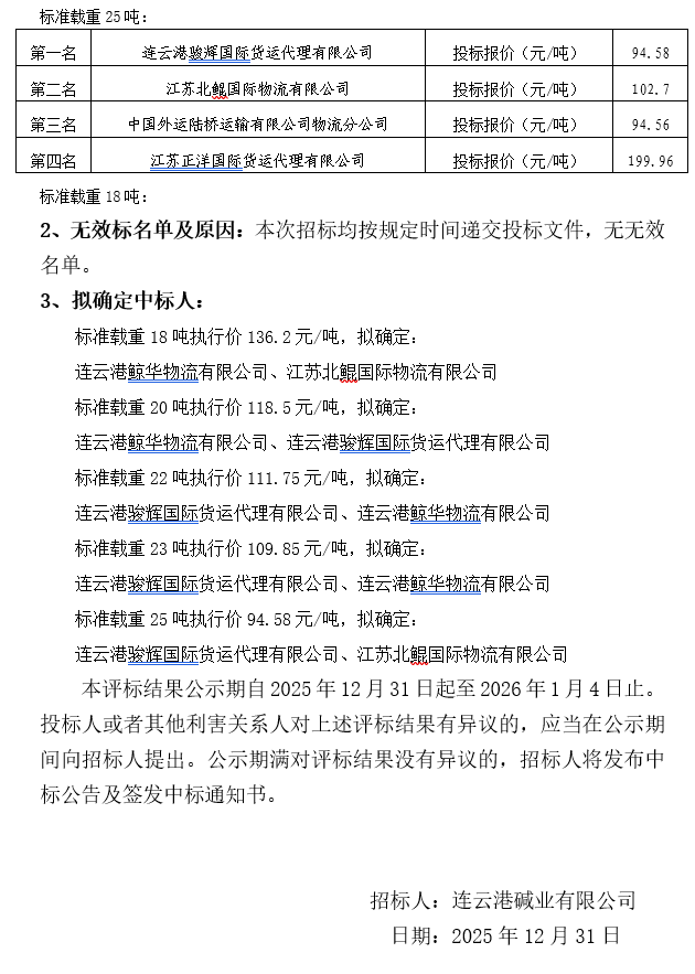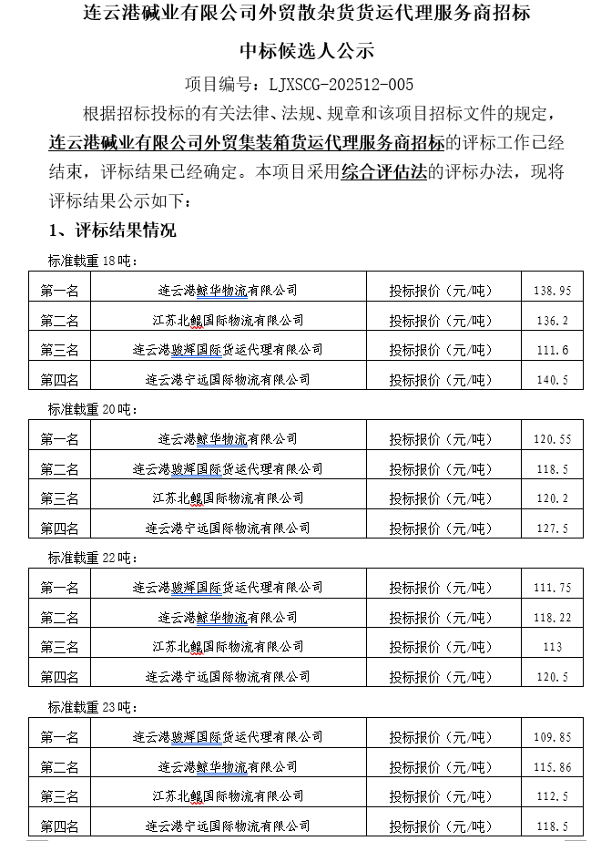 連云港堿業(yè)有限公司外貿(mào)集裝箱貨運代理服務商招標中標候選人公示