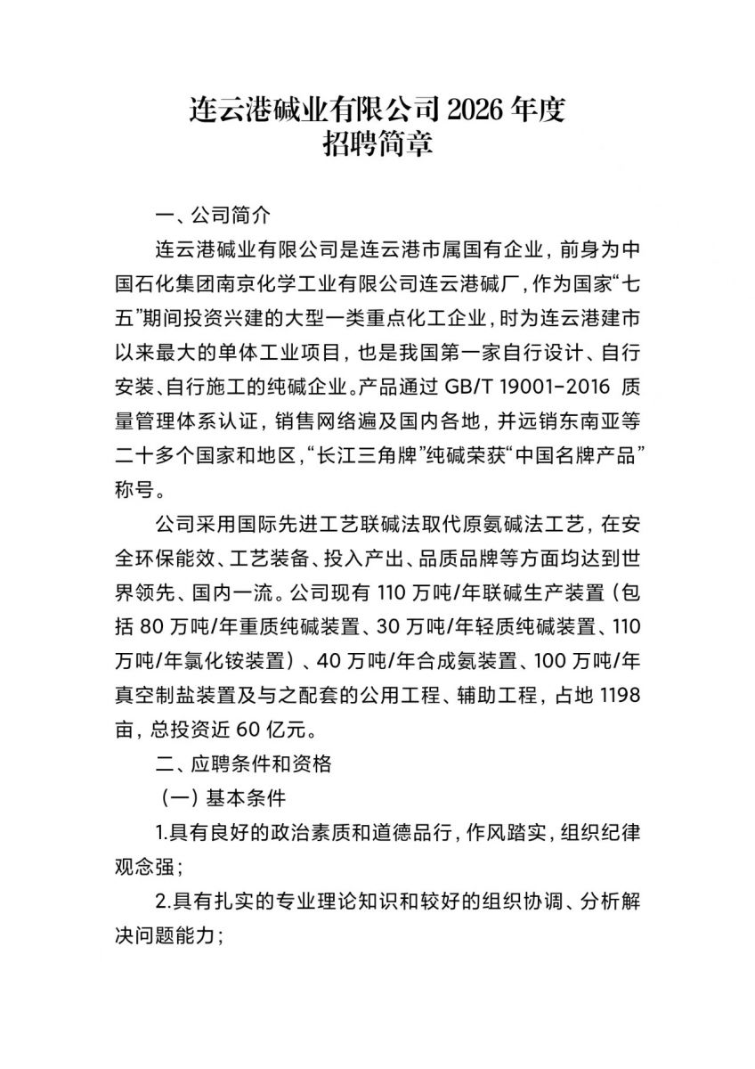 連云港堿業(yè)有限公司2026年度招聘簡章